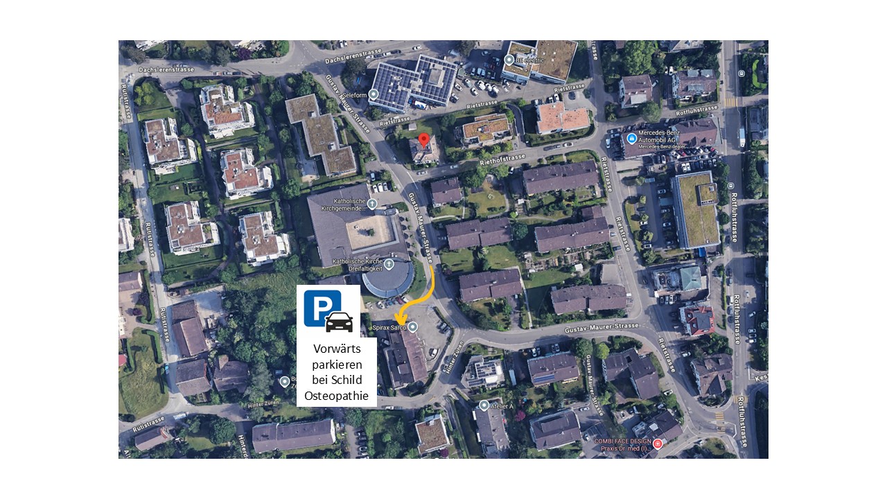 - Neben weissen Parkfeldern in der Umgebung steht meiner Kundschaft ein Parkplatz in Gehdistanz zur Verfügung (Plan, bei Schild Osteopathie)